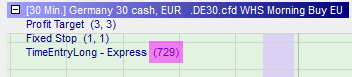 This example shows a four-day period with a buy signal each day. The green background in the chart indicates that the 240’ MACD is positive. At 7h20 the trader buys his position. The first three days the position is closed each time by the time filter. The fourth day the stop is hit. The position is closed with a loss.