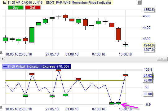 Dit voorbeeld tot een daggrafiek met daaronder de Pinball indicator. De indicator kaatst tussen de twee trigger niveaus (30.00 en 70.00). Vandaar de naam Pinball (flipperkast).